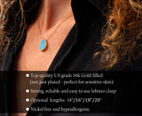 This vibrant gold electroplated turquoise slice hangs beautifully on a shimmering 14k gold filled chain necklace.