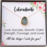 > Gold electroplated Labradorite slice pendant hangs beautifully from chain - making this necklace a perfect choice for daily wear.